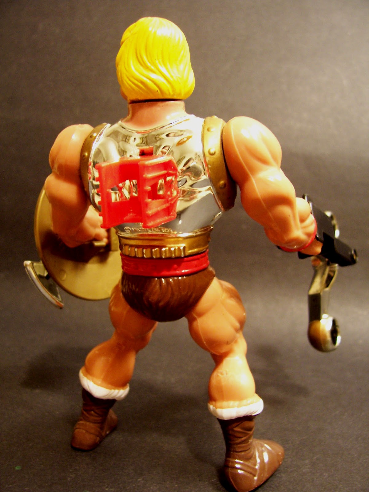 Quell pezzetto rosso é il sostegno per l'arma. Nel video per comodità la usano per ruotare il busto ma se guardi he-man da dietro ha quella specie di rotella fissa che serve per muovere il busto